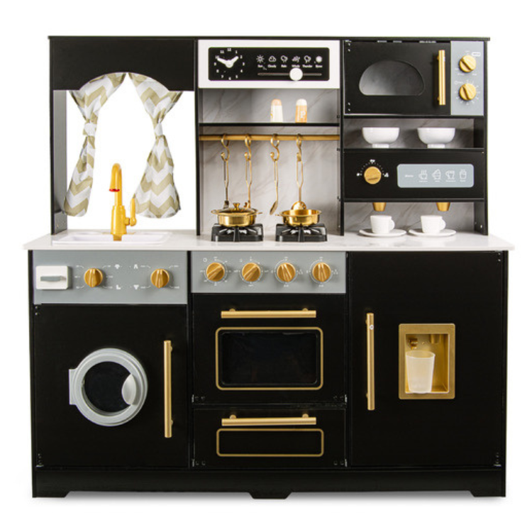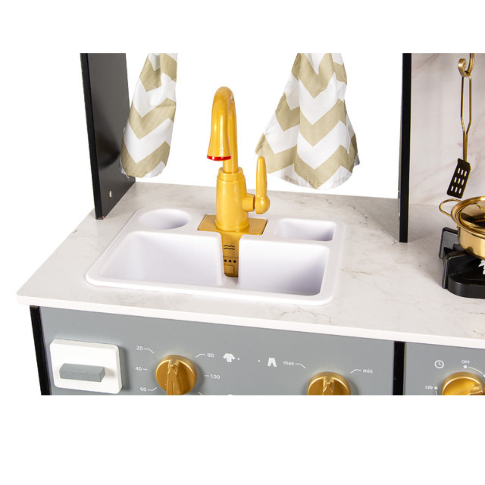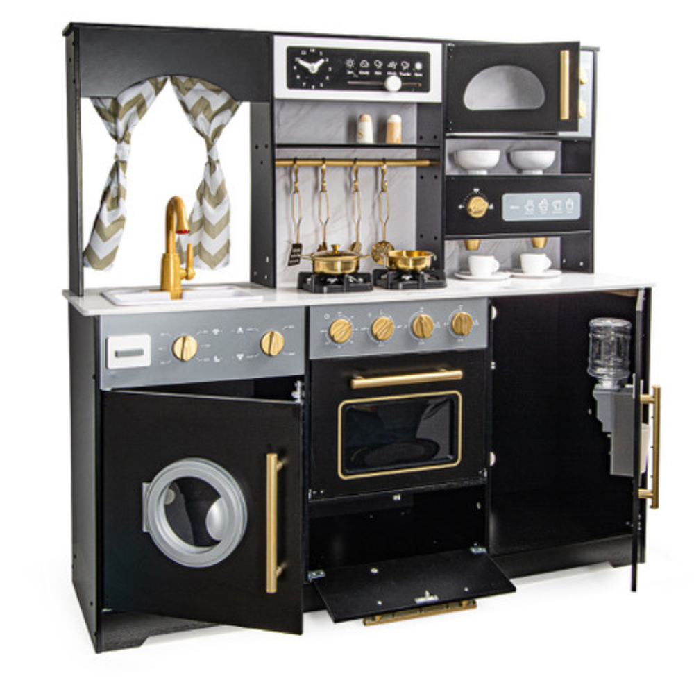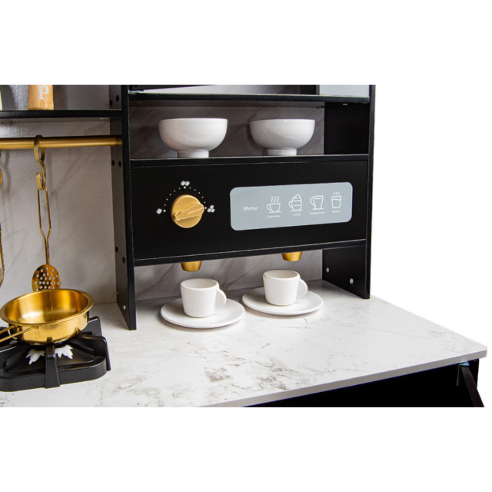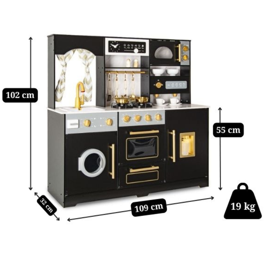 Offrez à votre enfant une cuisine en bois moderne et ultra-réaliste ! La Royal Black allie élégance et fonctionnalité : design noir et doré, plan de travail effet marbre, nombreux accessoires et des fonctionnalités interactives (sons, lumières, machine à café, lave-linge, micro-ondes, machine à glaçons et distributeur d’eau). Idéal dès 3 ans pour stimuler l’imagination et développer la créativité culinaire. Points forts de la cuisine Royal Black: