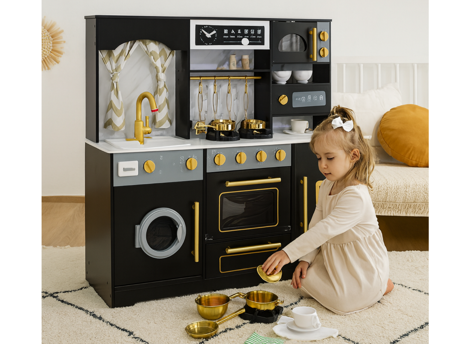 Accessoires inclus : 1 casserole dorée avec couvercle + 1 poêle dorée en métal , 4 ustensiles de cuisine en métal avec crochets, 2 tasses, 2 sous-tasses et 2 bols (plastique imitation porcelaine), 1 gobelet avec glaçons factices, 1 salière et 1 poivrière en bois, 1 éponge + 1 chiffon, 2 rideaux décoratifs Fonctions interactives :