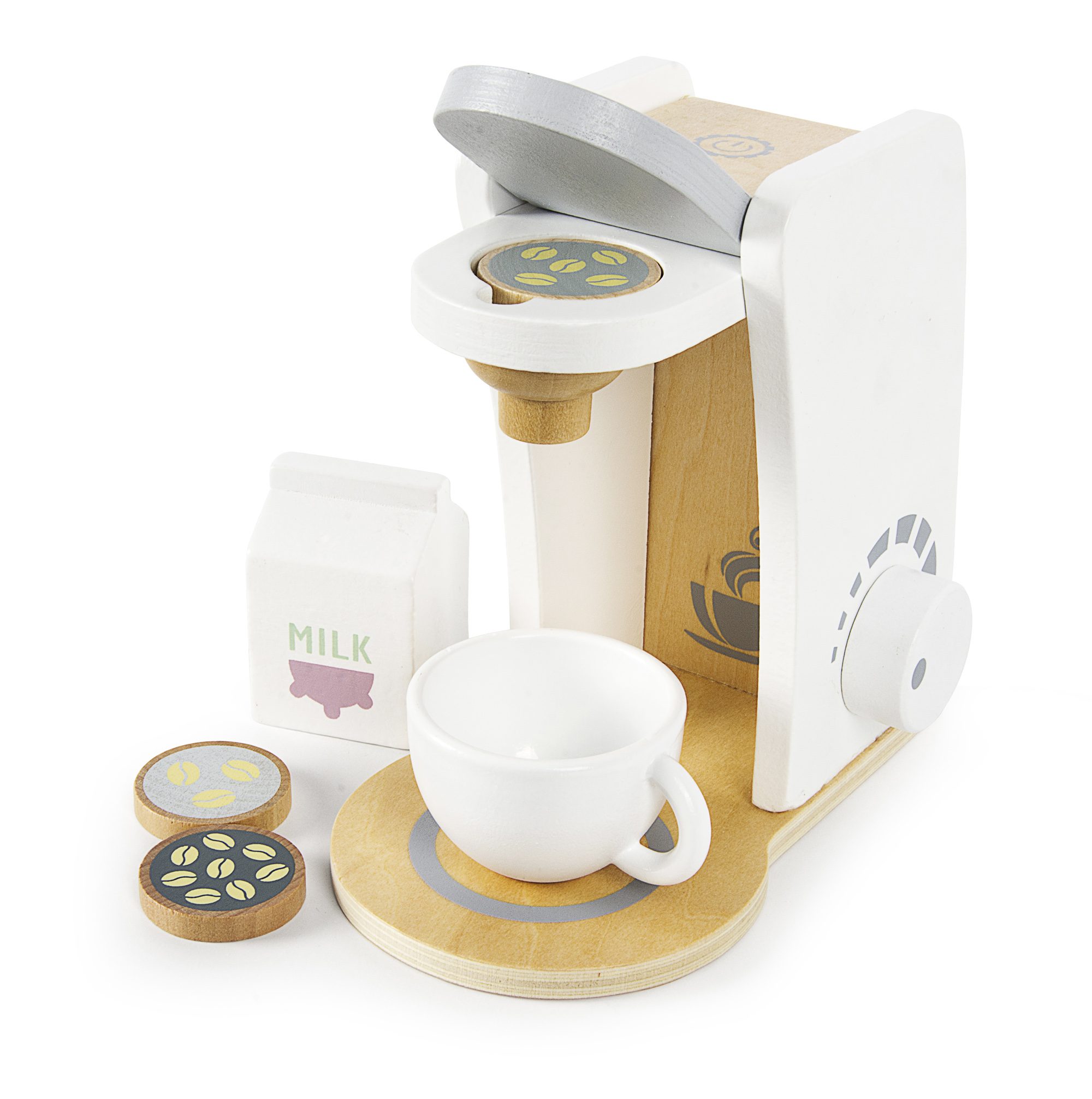 Votre enfant adore jouer dans la cuisine et en cuisine? Il est le petit cuisinier? Maintenat vous avez l'occasion de préparer les repas différents! Ensemble se compose de trois éléments en bois: grille-pain, mélangeur et machine à café. Tout les produits sont fait entièrement en bois de la plus haute qualité. Mélangeur: Dimensions du mélangeur: 17 x 9,5 x 18 cm (longueur/largeur/hauteur) Bol: (diamètre 11 cm, hauteur: 6 cm) Machine à café en bois: Le jouet a un couvercle ouvrable sous laquelle on peut placer les capsules (3 pièces). Chaque capsule a une empreinte de grains de café. En fonction de l'intensité du café que nous voulons préparer, nous choisissons une capsule avec le nombre approprié de grains. De plus, un bouton mobile a été placé sur le côté de la machine, ce qui nous permettra de régler quantité de café. Nous ajoutons du lait et notre Latte est prêt!